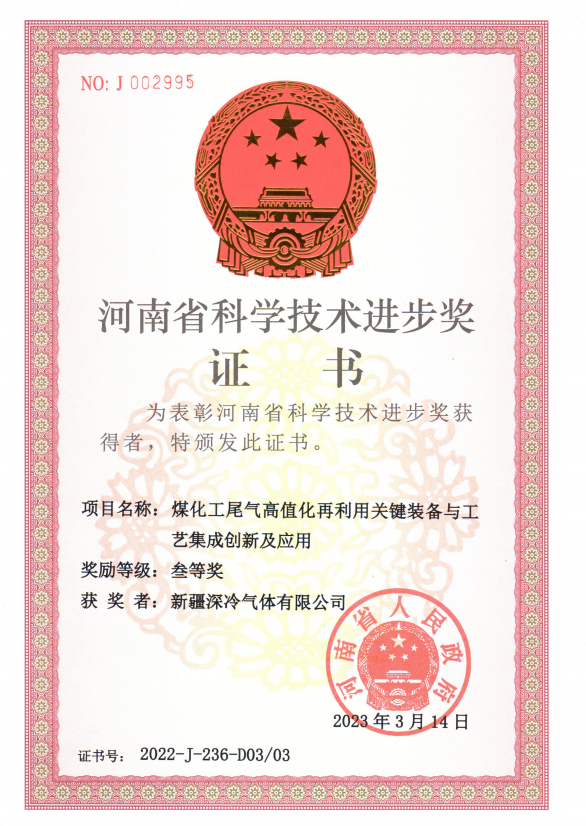 近日,河南省人民政府网站发布《河南省人民政府关于2022年度河南省科学技术奖励的决定》(豫改[ 2023 ]13号),由河南心连心深冷能源股份有限公司、中南大学及新疆深冷气体有限公司联合研发的“煤化工尾气高值化再利用关键装备与工艺集成创新及应用”成果获得河南省科学技术进步三等奖。